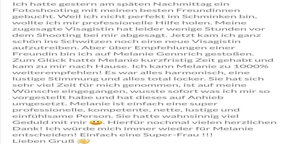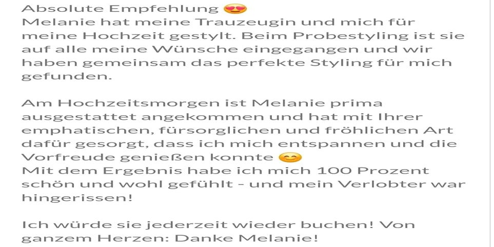 Ich würde Melanie immer wieder buchen und kann sie nur wärmstens empfehlen! Ich hatte sie als Visagistin für meine Hochzeit und ich bin einfach froh, dass ich sie an diesem besonderen Tag an meiner Seite hatte. Sie hat so eine liebevolle und beruhigende Art, dass diese Ruhe trotz Aufregung auch auf mich abgefärbt ist. Vorab hatten wir uns bei einem Probestyling kennengelernt und dabei hat sie sich viel Zeit genommen, um auf alle Wünsche einzugehen und auch zu ermöglichen. Sie hat für mich das perfekte Styling kreiert so, dass ich mir treu geblieben bin aber es auch etwas besonderes war. Das ganze hat unfassbar gut gehalten. Dank ihr sah ich den ganzen Tag gut aus, habe mir keine Sorgen machen müssen was das anbelangt und habe mich einfach wohl gefühlt. Preisleistung ist dabei auch absolut fair und man bekommt wirklich Qualität mit guten Produkten geboten.